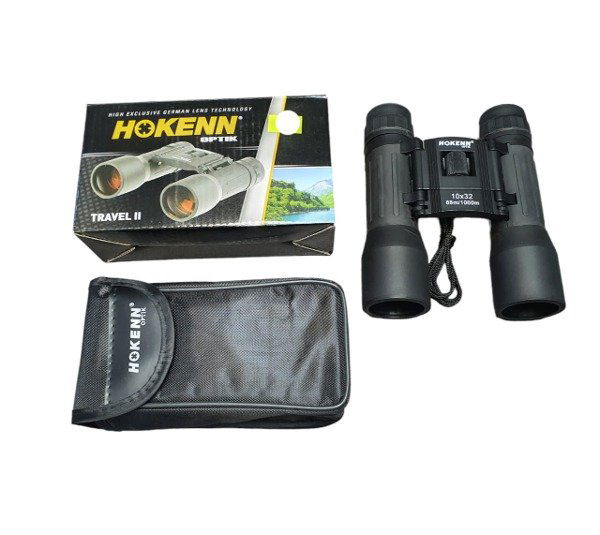 Binoculares Hokenn en color negro, ideales para actividades al aire libre como trekking, camping y montañismo.